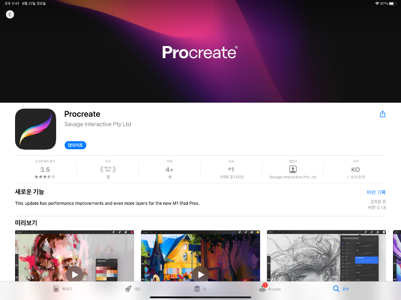 - 프로크리에이트 최신 버전이 설치된 아이패드