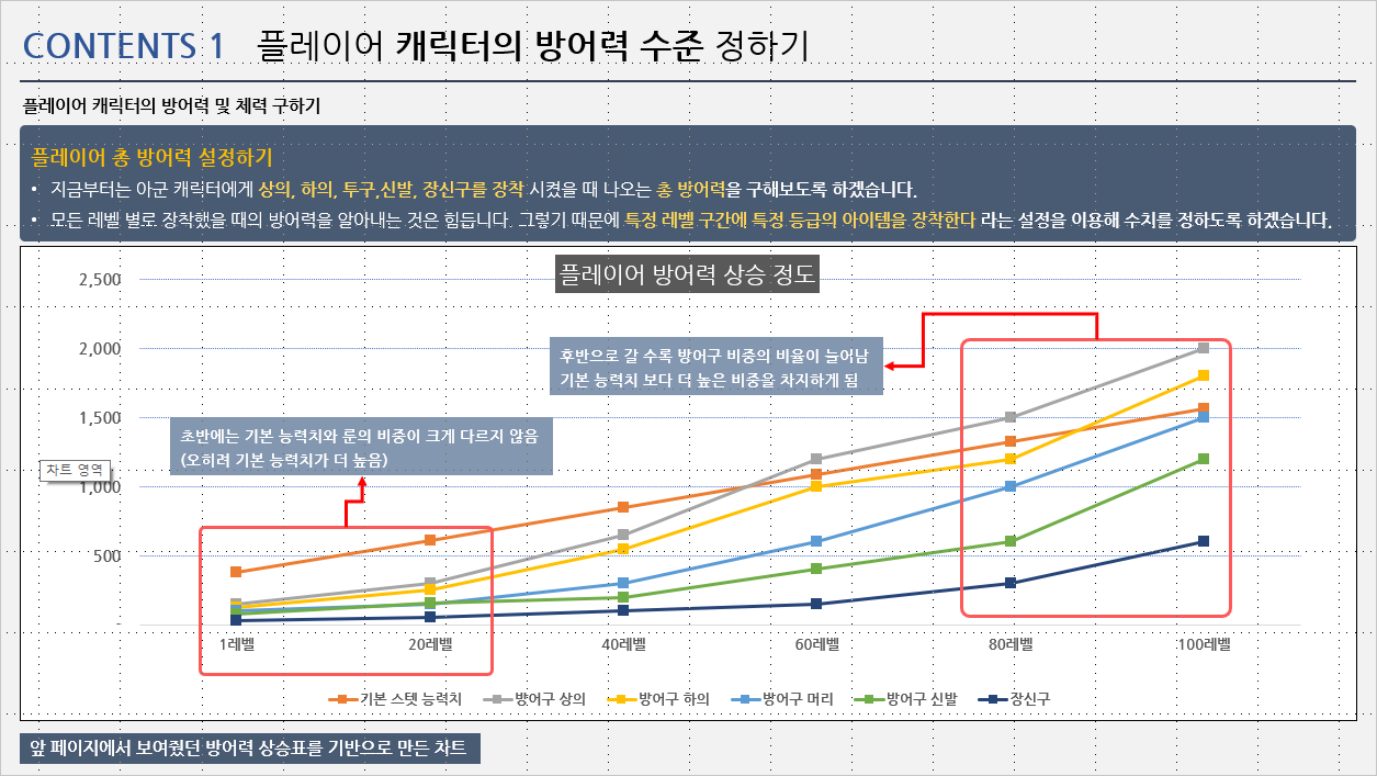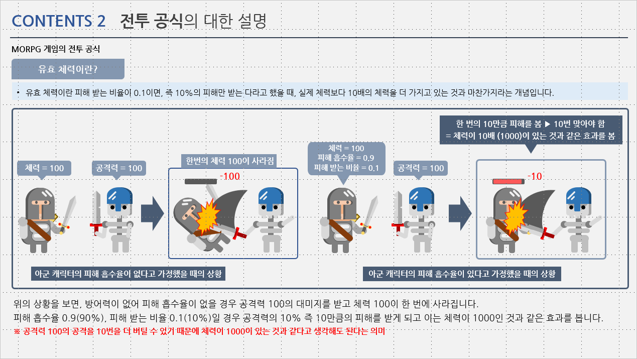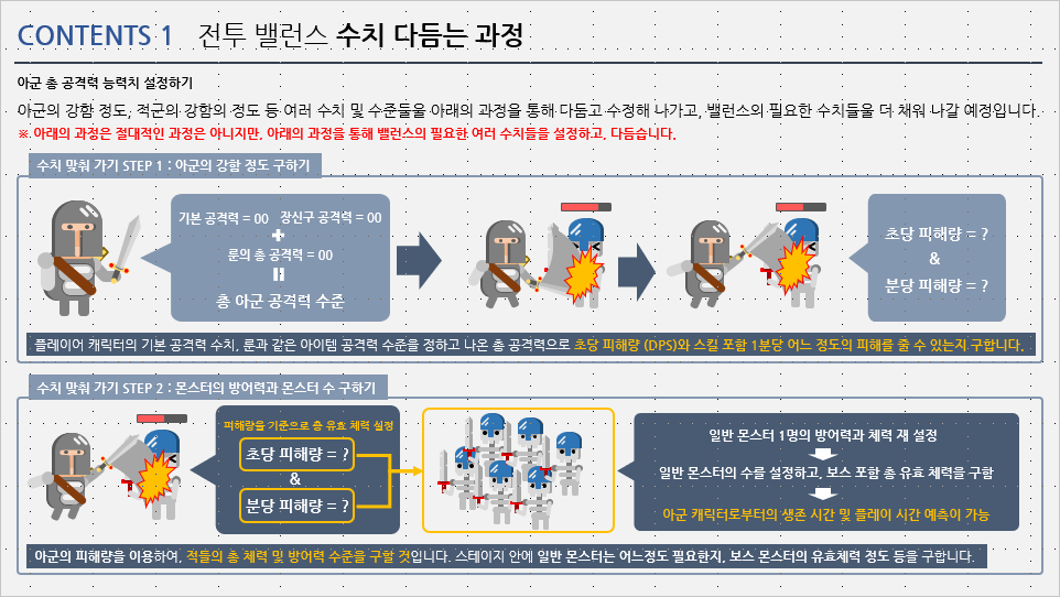 1. 이미지 및 표, 수치, 그래프를 이용하여 전투 밸런스에 대한 내용을 쉽게 이해할 수 있게 합니다.