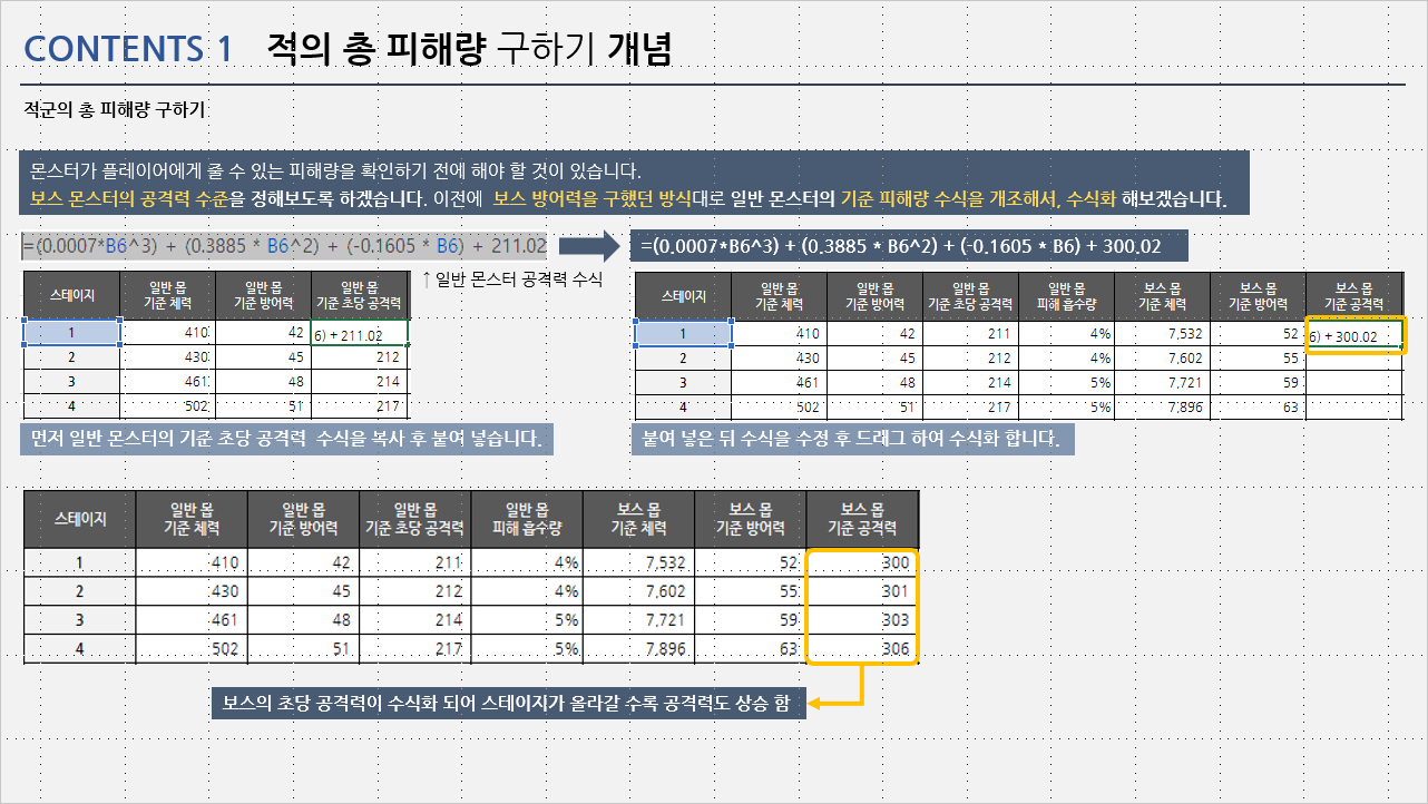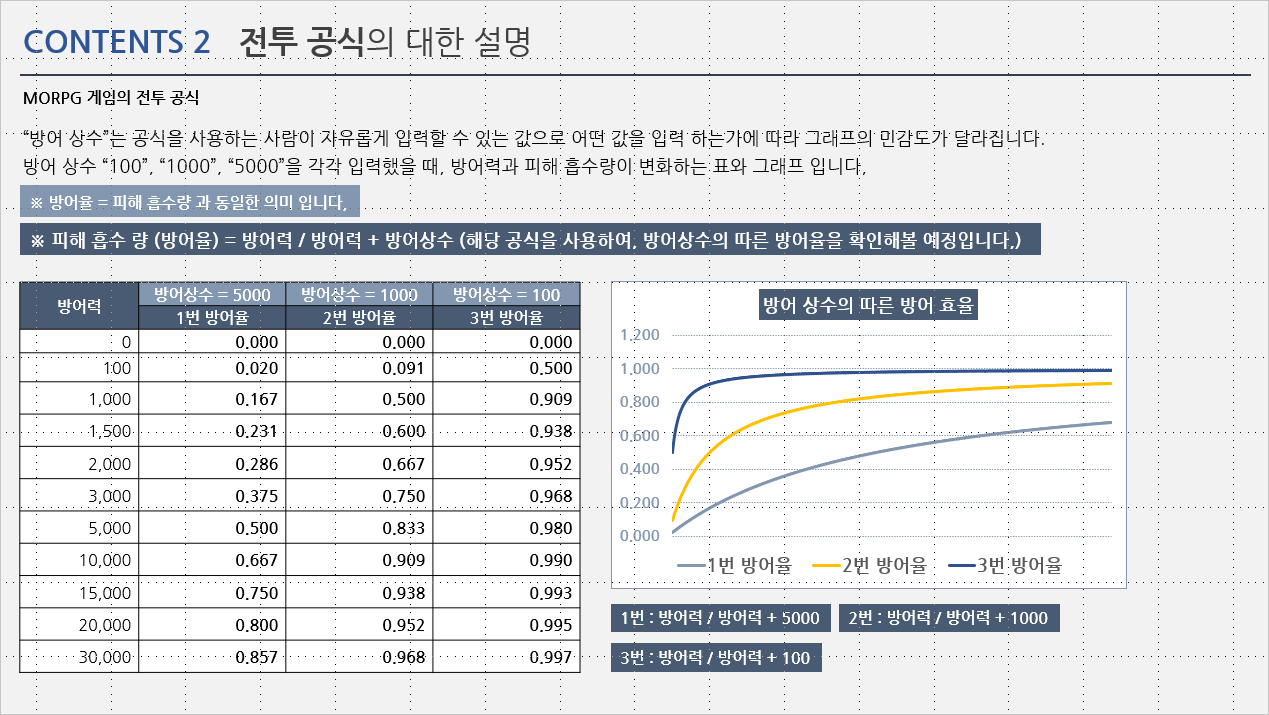 2. 전투 관련된 공식을 알려주어, 공식이 작동하는 원리와 밸런스의 어떠한 영향을 주는지 알려줍니다.