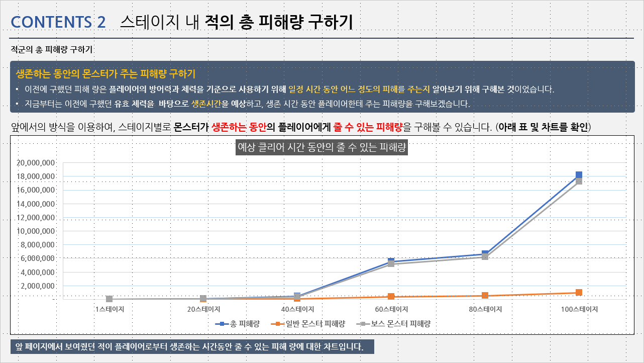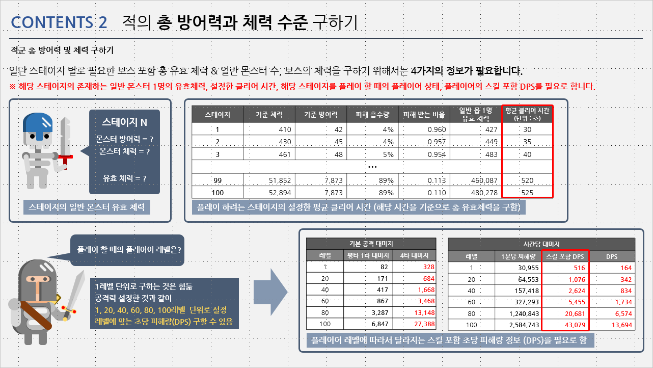 플레이어가 일정 시간동안 주는 피해량, 게임 플레이 시간을 이용하여 적군의 총 유효 체력을 설정합니다.