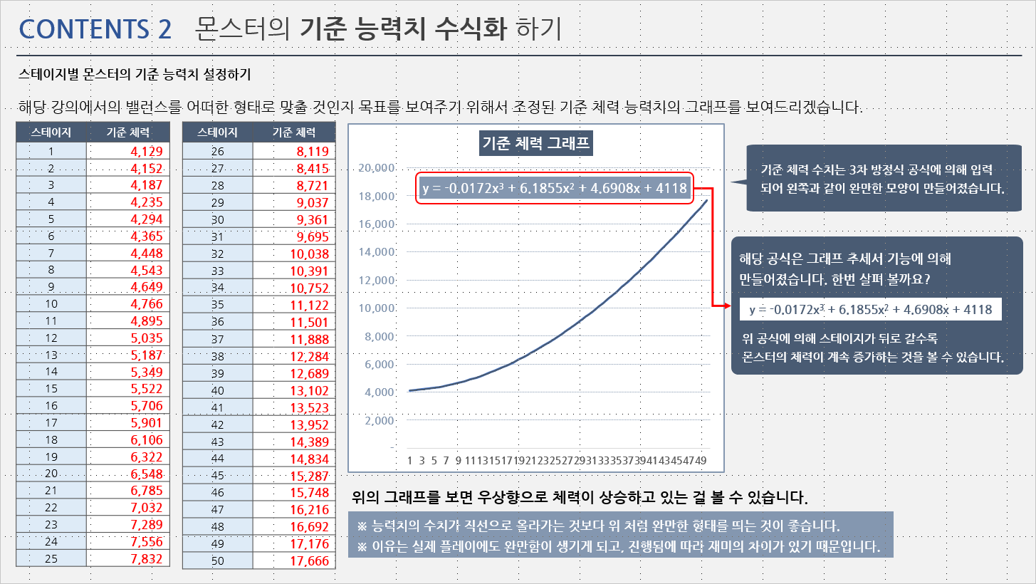 스테이지 100개의 존재하는 몬스터 들의 평균적인 능력치(공격력, 방어력, 체력)을 엑셀의 추세선을 이용하여 수식화 하는 방법을 설명합니다.