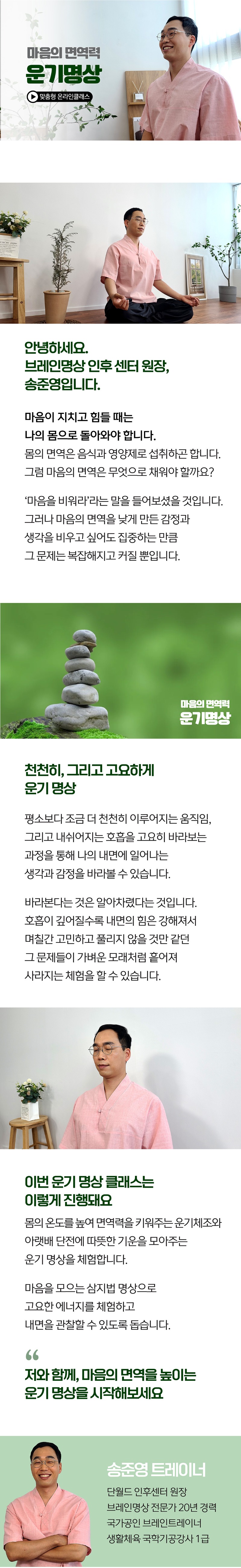 각 수업의 트레이너님들은 최소 10년에서 20년 이상의 경력이며, 현재 전국 200여 개의 브레인 명상센터의 원장, 부원장님으로 활동하며 회원분들을 열정적인 마음으로 상담하고 코칭 해드리고 있습니다.