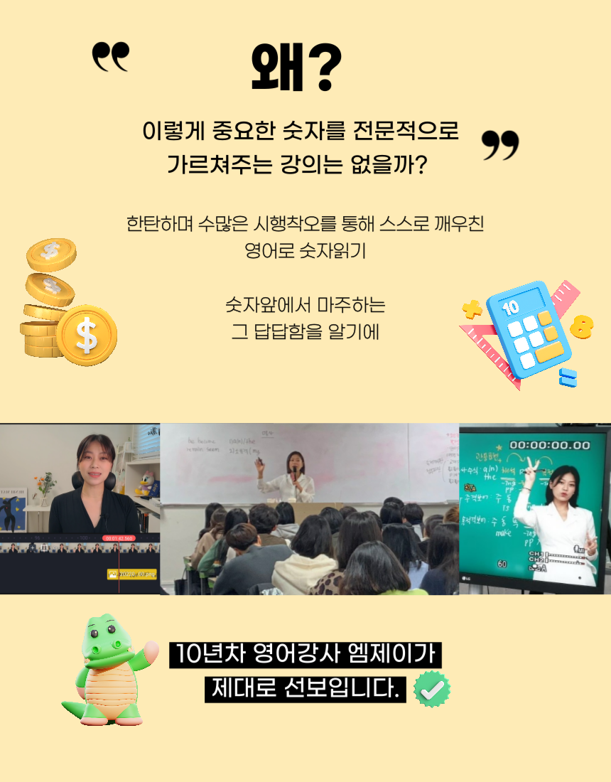 안녕하세요 12년차 영어강사 엠제이입니다. "언어의 한계는 세계의 한계다." 철학자 비트겐 슈타인의 말처럼, 단순 도구로써의 영어를 넘어 수강생 분들의 또 다른 세계관 확장을 돕는다는 사명으로 강의해오고 있습니다. 12년동안 수능, 토익, 회화 등 다양한 컨텐츠를 강의해오며, 한국에서 영어학습을 하는 분들께 꼭 필요하다고 느낀 컨텐츠를 제작하고 있습니다.