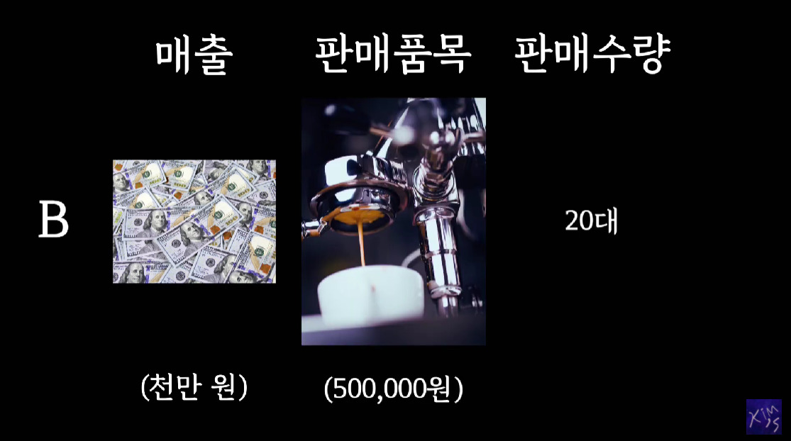 B는 50만 원의 커피 머신을 20대만 팔면 됐기 때문입니다.