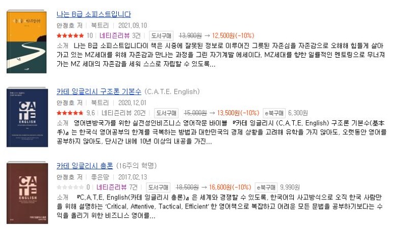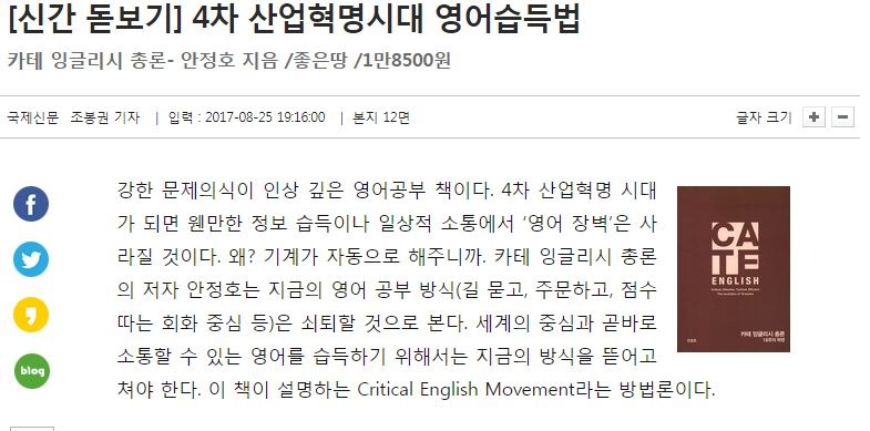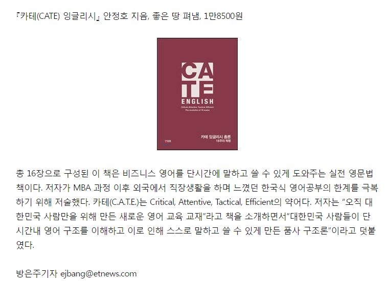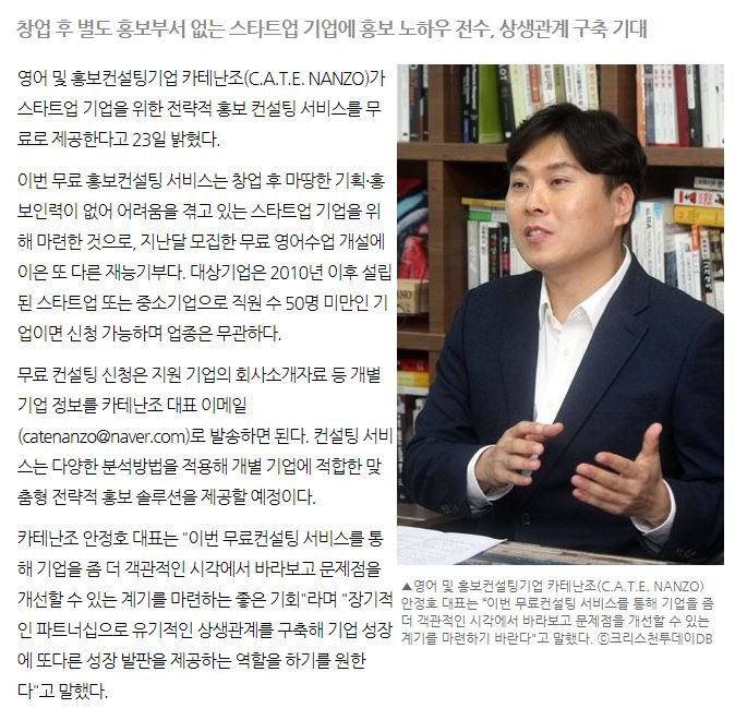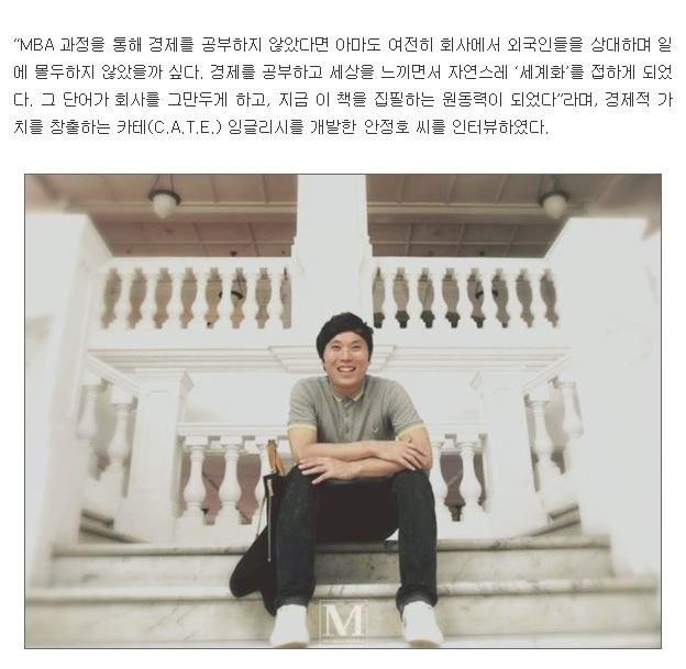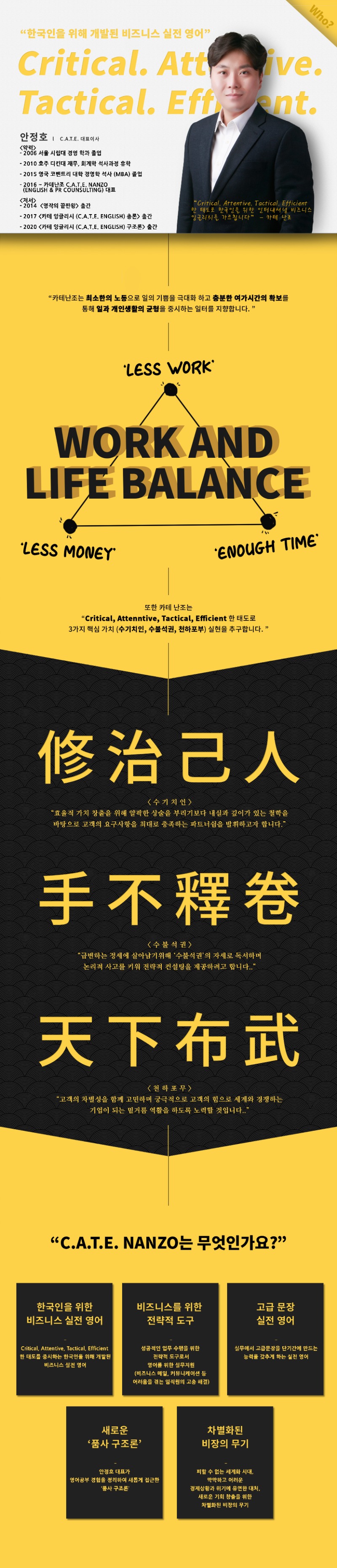 서울 시립대학교 경영학을 전공 후 Deakin University에서 Accounting & Finance 석사 과정 휴학 후, Coventry University에서 MBA 석사 과정을 마쳤습니다. 싱가포르에 있는 다국적 기업에서 세계인과 경쟁하면서 뜻하는 바가 생겨 귀국 후, 현재 카테난조(C.A.T.E. NANZO)를 운영하면서 대한민국의 불안한 경제 상황을 이겨내기 위한 퍼스널 브랜딩 컨설팅과 카테(CA.T.E.) 잉글리시를 계발해 새로운 관점으로 비즈니스 영어를 가르치고 있습니다.