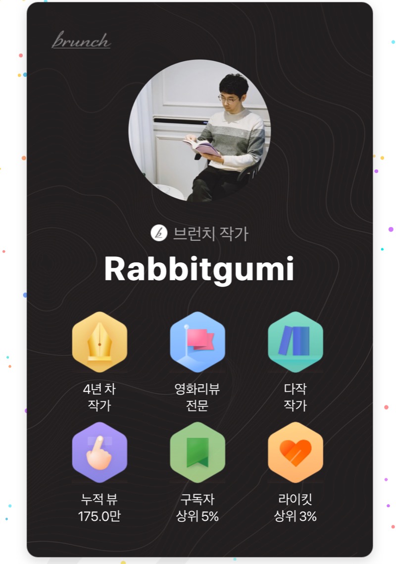 저는 레빗구미라는 필명으로 다음 브런치를 중심으로 영화 리뷰를 쓰고 있는 김동근 이라고 합니다.
