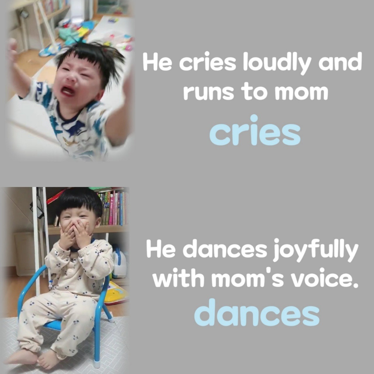 아기가 울고, 웃고, 뛰는 모습 등을