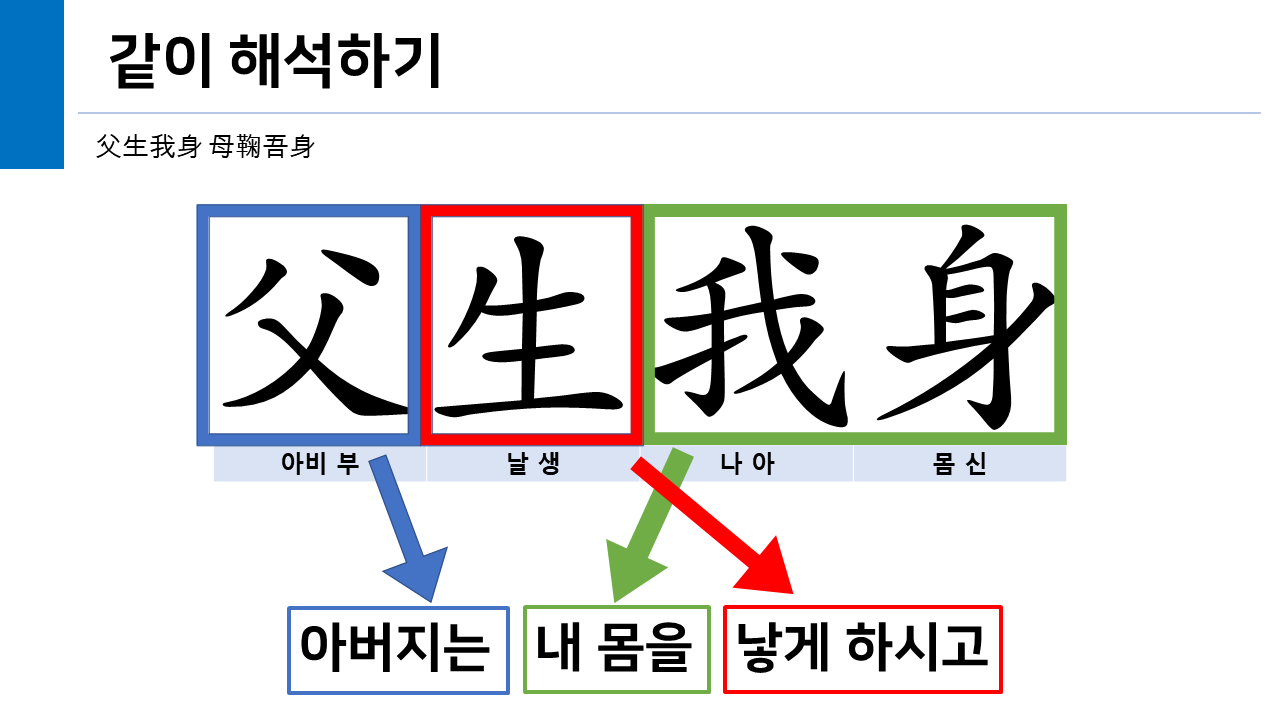 여러 가지 중에 하나, 저는 초등학교 시기에는 한자와 한자어 공부가 필요하다고 생각했습니다. 저는 사실 한자 전문가도 아니고 한자 관련 전공자도 아닙니다. 제가 한자 전문가에 비해 한자에 대한 지식이 부족할지라도 아이들이 어떻게 한자 공부를 해야 어휘나 문장을 잘 이해하는 힘을 기를 수 있을지를 고민하고 이 사자소학 클래스를 만들었습니다.